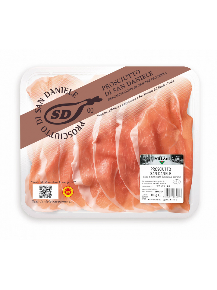 Prémium eredet védett Olasz 16 hónapig érlelt San Daniele sonka. Szakértői kezek által gondosan válogatott alapanyagból készült. Sózós után a megfelő ideig pihentetik, hogy gondos és megfelelő pácolás jöjjön létre. A Villani Udinei üzemében érlelik 16 hónapon át. Egyedülálló ritka PDO minősítéssel rendelkező San Daniele sonka.